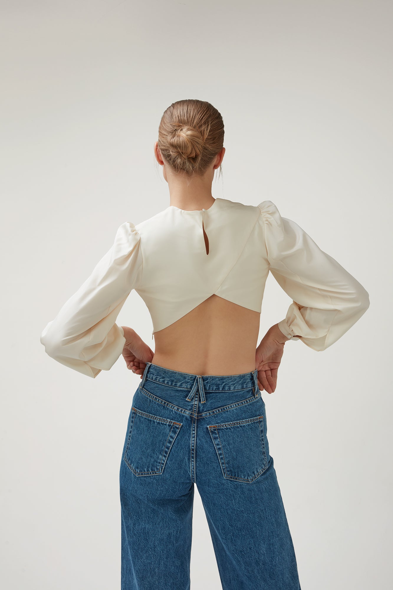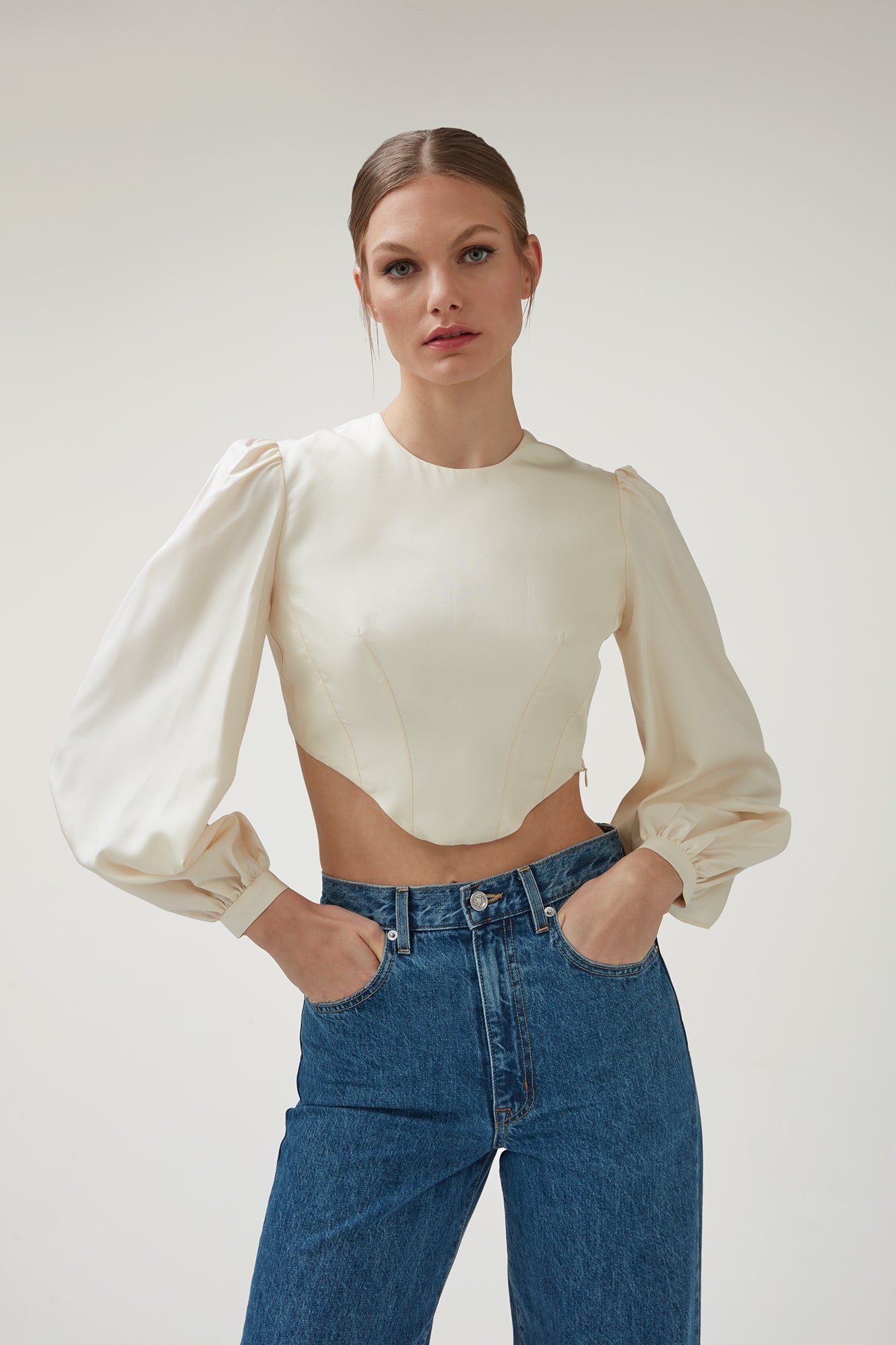 A delicate ivory blouse made from 100% Italian silk Poplin and lined with 100% silk satin. The cropped corset-inspired bodice, backless crossover detail, and exaggerated bishop sleeves create a dramatic look that resonates soft femininity.